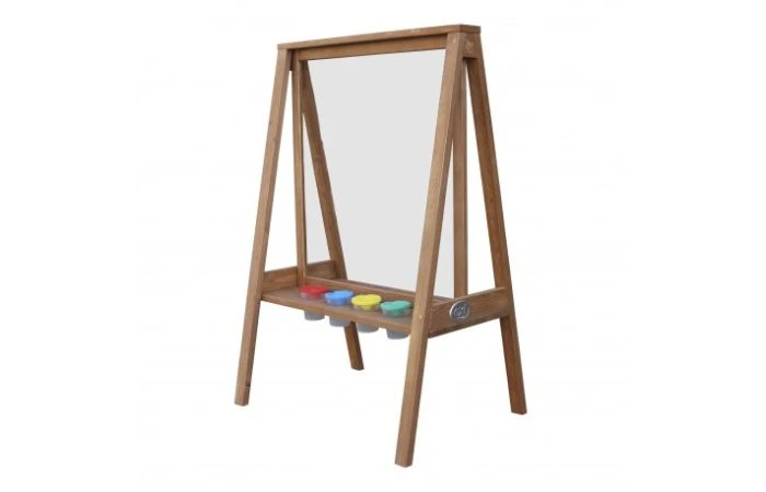 De schildersezel wordt geleverd met een handig canvas van plexiglas. Plexiglas is eenvoudig om schoon te maken. Zo kan je kind bij de volgende schildersessie direct weer aan de slag gaan! De verf kan in de vier gekleurde bakjes – groen, rood, blauw en geel – gegoten worden. Dat ziet er niet alleen leuk uit, maar verkleint ook de kans op het omstoten van potjes verf. Zo blijft alles netjes terwijl je kinderen hun eigen meesterwerk creëren! Aan de andere zijde van de ezel is voldoende ruimte om ander tekengerei neer te leggen, zodat er aan twee kanten tegelijk gespeeld kan worden.