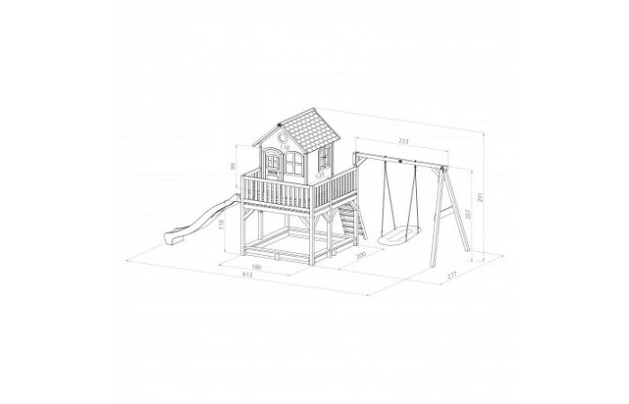 Speelhuis Liam heeft een platformhoogte van 118 cm en een totale hoogte van 291 cm. Het speelhuis is 277 cm lang en 613 cm breed. Met een binnenmaat van 115 x 113 cm en een nokhoogte van ca. 166 cm is Liam een middelgroot houten speelhuis.