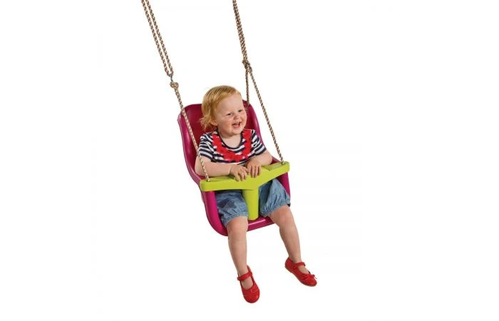 De T-bar wordt geleverd met 3 bevestigingspunten, voor extra veiligheid. Het turquoise babyzitje heeft een geel PP-touw met turquoise lassen, terwijl de andere kleuren natuurlijk gekleurd touw met zwarte PP-lassen hebben.