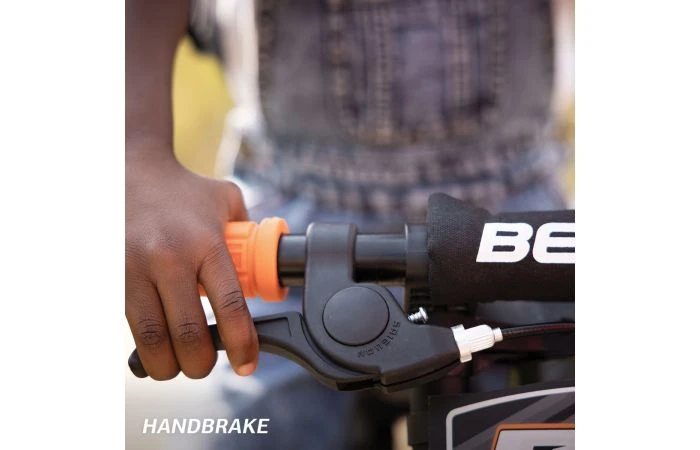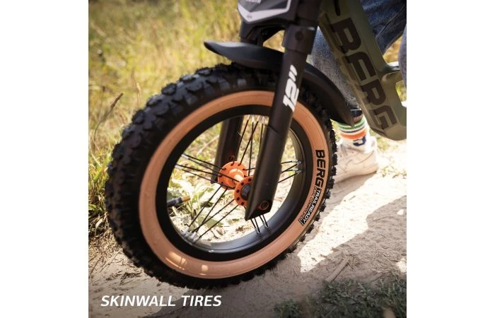 De off-road looks van deze Biky, maken het tot een unieke verschijning. Wie oog heeft voor details, ziet direct de opvallende 12 inch wielen met skinwall banden. Als je goed kijkt, zie je ook de oranje voor-en achternaaf. Verder is de Biky voorzien van comfortabele oranje handvaten, een valkussen op het stuur en een stevige dubbele voorvork. Deze voorvork is gemaakt van aluminium, zodat deze Biky lekker licht blijft.