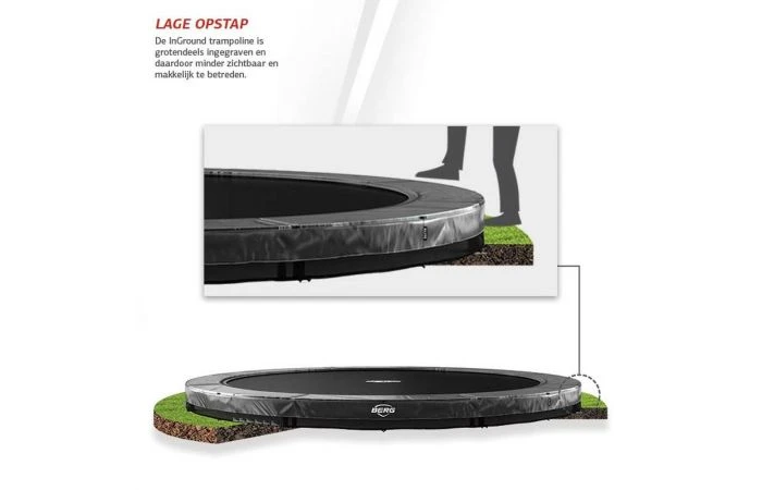 De BERG InGround Sports trampoline is echt bedoeld als een sporttoestel, om balans & lichaamscontrole te trainen en fitheid te verbeteren. De ingegraven trampoline zonder net (sports) is weggewerkt in je tuin. Door de lage opstap van 20 centimeter is de trampoline makkelijk en veilig te betreden.