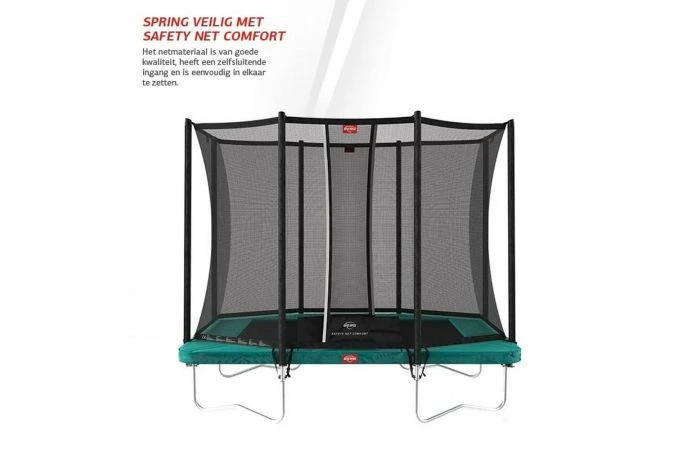 Je kunt veilig trampoline springen door het hoge Safety Net Comfort. Doordat het net aan de buitenrand van de padding bevestigd is ontstaat er een groter springoppervlak. Dit net is extra veilig door de zelfsluitende ingang met herkenbare witte bies en door het dikke schuim rondom de safetynetpalen. De stevige paalhoezen beschermen de Safety Net palen tegen weersinvloeden.