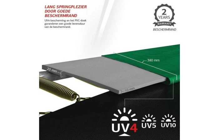 Het is een duurzaam springdoek van zeer sterk geweven polypropyleen. De lussen voor de metalen verenogen zijn bevestigd met 8 rijen stiksel.