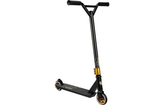 Laat ze zien hoe het moet met je prachtige Black Dragon Gilded Tarragon stuntstep! Deze limited edition Black Dragon stuntstep heeft een extra sterk rechthoekig aluminium en heavy-duty stalen frame met een triple stuurstang klem. Speciaal gemaakt om trucjes mee te doen dus. De luxe, aluminium gespaakte kern wordt gecombineerd met harde 85A wielen en ABEC 9 carbon lagers, dit maakt de Gilded Tarragon tot een snelle, stevige en super wendbare stuntstep die de impact van stuntstep tricks (leren) makkelijk aankan! Je hebt een goede grip op de weg of skatebaan en de wielen draaien extra soepel. De comfortabele rubberen handvatten hebben extra stootbescherming aan de uiteinden en op het achterwiel zit een stalen flex voetrem. Als laatste heeft de step een prachtige luxe design met een stoere uitstraling, je steelt gegarandeerd de show met deze vette stuntstep. De maximale belasting is 100 kg en de step komt met 2 inbussleutels voor de stuurklem.