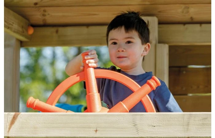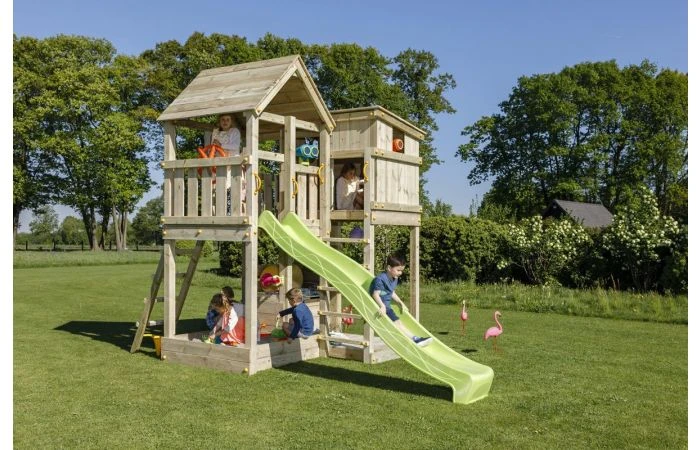 De Blue Rabbit Palazzo is zo groot dat je kinderen nooit uitgespeeld raken. Hij beschikt over een groot platform met een balkon aan de zijkant en is verbonden met een gesloten cabine, die perfect is om je in te verstoppen of lekker in te liggen. Eronder zit een enorme zandbak en een zitgedeelte met een houten vloer en een bankje dat ook nog eens dient als opslagplek met handige deksel.