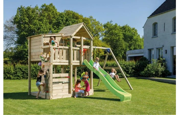 LET OP: Het houtpakket wordt geleverd zonder glijbaan, schommel en accessoires, deze kunnen bij besteld worden.