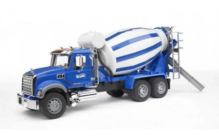 Bruder MACK-Granite betonwagen. De motorkap kan geopend worden, zodat het gedetaileerde motorblok zichtbaar wordt. De betontrommel kan draaien en afhankelijk van draairichting kan deze ook zijn lading uitstorten. Erg gedetailleerd met verchroomde delen.