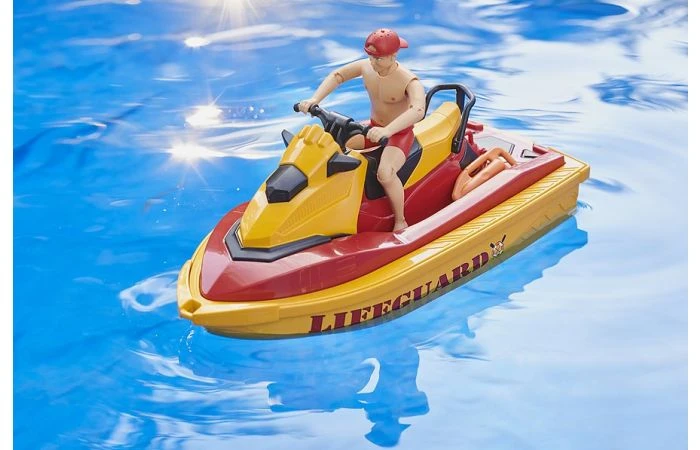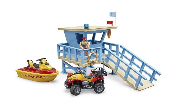 Bruder BWorld reddingsbrigade met voertuigen en speelfiguur. De leuke set bestaat uit een uitkijkpost van de reddingbrigade, een quad, jetski en hulpverlener. De waterscooter kan echt drijven.