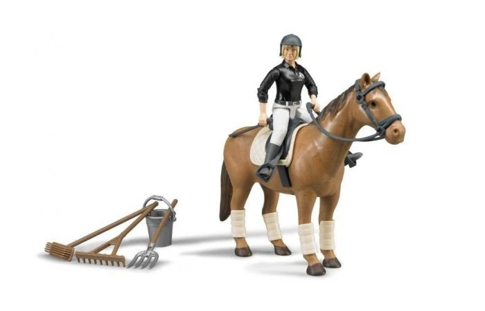 Kleur: bruin paard; amazone: blanke vrouw met blond haar en witte broek