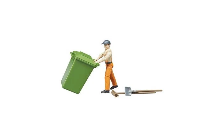 Speelfiguur “Vuilnisman” in werkkleding met accessoires zoals een pet, vuilcontainer, bezem en schep.