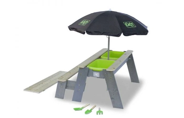 Het blad is afneembaar waardoor kinderen het ene moment met het EXIT Tuingereedschap een zandkasteel kunnen bouwen en het andere moment, als het blad er weer op zit, heerlijk kunnen knutselen, bouwen of tekenen. Het bankje is verstelbaar zodat je zelf kunt bepalen wat de zitafstand is tot aan het werkblad; 22,5cm of 18,5cm.