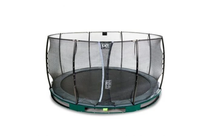 De EXIT Elegant inground trampoline met Economy veiligheidsnet is een grote ronde ingraaftrampoline van goede kwaliteit met een grijze beschermrand en een groene rok. Deze trampoline graaf je deels in de grond, wat niet alleen extra veilig is maar ook mooi oogt in de tuin. De Elegant inground trampolines met Economy veiligheidsnet zijn veilig, mooi en eenvoudig op te bouwen!