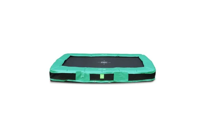 De EXIT InTerra trampoline is een rechthoekige trampoline met groene beschermrand, die absoluut niet misstaat in de tuin. Voor deze trampoline graaf je een rechthoekige kuil in de grond waar de trampoline in wordt gezet voor een mooi en veilig resultaat. Ook heb je bij de EXIT InTerra trampoline geen last van een ‘plof’ geluid tijdens het springen door de praktische ventilatiegaten die de lucht laten ontsnappen.