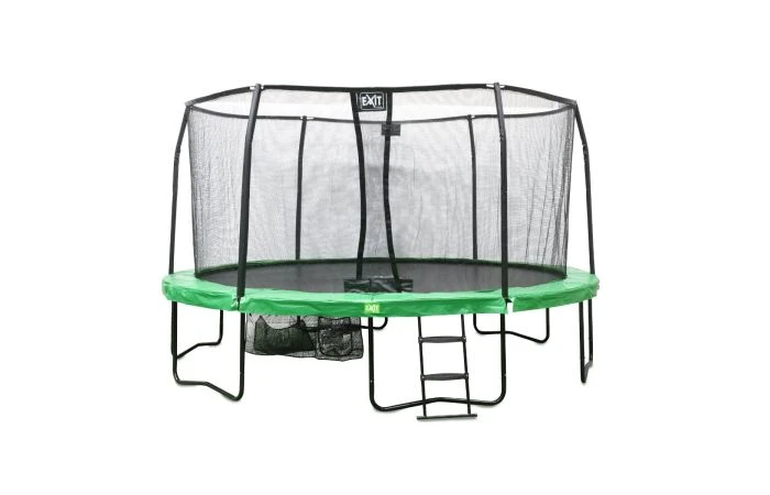 De EXIT JumpArena trampoline is een grote ronde trampoline op poten met omkeerbare beschermrand in de kleuren groen en grijs. Als je voor een JumpArena kiest krijg je meer dan alleen een trampoline, want ook het veiligheidsnet, een handige schoenenzak en ladder zitten bij deze trampoline inbegrepen.