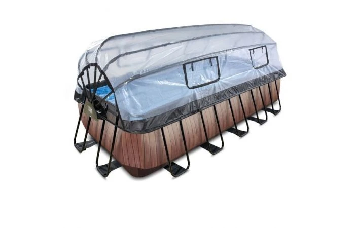 Het EXIT Stone zwembad 540 x 250 x 122 cm is een rechthoekig grijskleurig frame zwembad met overkapping. Dit grote zwembad is standaard voorzien van een zandfilterpomp en een zwembadtrap, waarmee je veilig het zwembad in en uit kunt stappen.