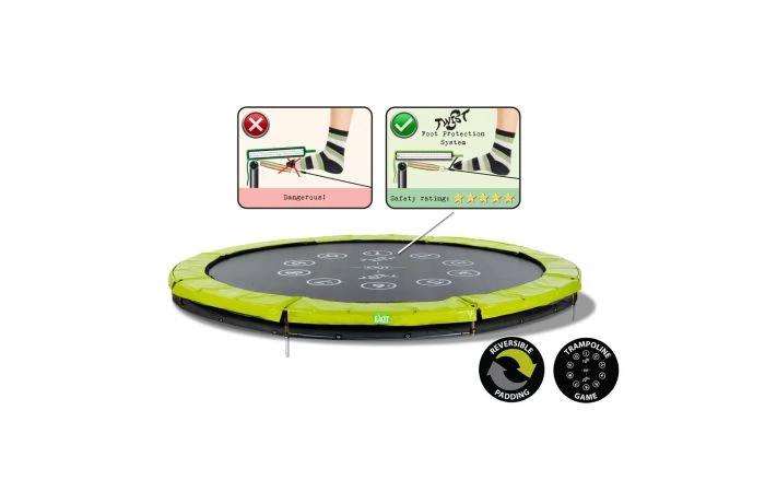 De EXIT Twist inground trampoline is een grote ronde trampoline met omkeerbare beschermrand in de kleuren groen en grijs. Voor deze trampoline graaf je een komvormige kuil in de grond waar de trampoline in wordt gezet voor een mooi en veilig resultaat.