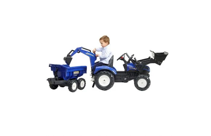 Deze Falk New Holland blauwe traptractor is uitgevoerd in origineel New Holland design, heeft een totale lengte van 220 cm en wordt geleverd inclusief aanhanger. Het is een mooie traptractor van een robuuste kwaliteit, heeft kunststof wielen die zeer slijtvast zijn en het stuur bevat een toeter met geluidsfunctie. De tractor heeft naast een aanhanger aan de achterkant ook nog een shovel aan de voorzijde. De shovel kan door middel van de beweegbare laadarmin verschillende standen worden gezet. Tevens zit er aan de achterzijde ook nog een een graafarm die handmatig te bedienen is. De aanhanger is makkelijk te koppelen en te ontkoppelen: zo kan er van alles vervoerd worden.