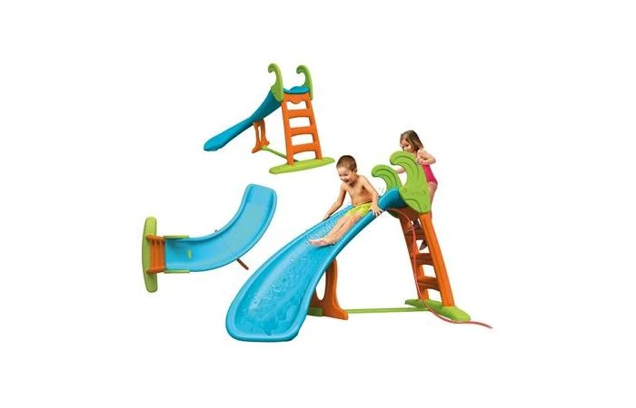 Glijbaan van Feber met fantastische bocht. Voorzien van een wateraansluiting en met een zeer stabiele constructie. Het geheel is dubbelwandig uitgevoerd voor jarenlang speelplezier. Â