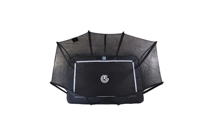 Rechthoekige Game on Sport Jumpline Trampoline set (trampoline + net), met een afmeting van 213 x 335 cm. In zwarte kleurstelling. Specificaties: max. gewicht springer: 120 kg. Voorzien van anti-roest veren van 16,5 cm lang.