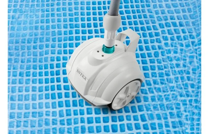 De Intex zwembadstofzuiger is een automatische bodemzuiger, die werkt op druk van uw zwembadpomp. Deze bodemzuiger reinigt uw bodem zelfstandig. Bladeren, zand en insecten worden automatisch van de bodem opgezogen. De ene kant van de slang dien je op de bodemzuiger te bevestigen en de andere kant op de uitlaat van het zwembad waar het schone water van de pomp terug het bad in stroomt. Door de zuigkracht van de pomp wordt al het vuil verwijderd. Als de zuiger bij een wand komt zal deze automatisch van richting veranderen. Zo maakt de Auto Pool Cleaner het zwembad schoon, zonder dat je er omkijken naar hebt. Om optimaal te kunnen werken, vereist de bodemzuiger een filterpomp met een capaciteit tussen de 3.407 en 5.678 liter per uur.