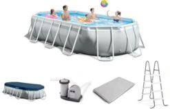 De levering bevat 1 x zwembad, 1 x filterpomp, 1 x trap, 1 x afdekzeil en 1 x grondzeil.