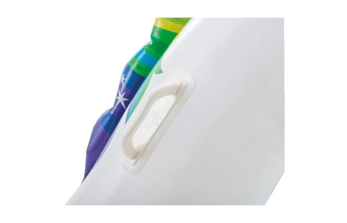 Op deze vrolijke opblaasbare eenhoorn maak je het zwemplezier nog groter! De eenhoorn beschikt over 2 handvaten en 2 luchtkamers. Afmetingen: 201 x 140 x 97 cm.