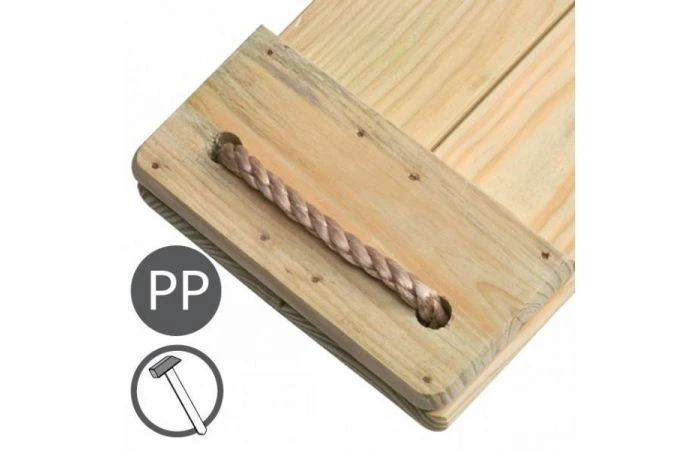 Het schommelzitje is verkrijgbaar in twee verschillende versies. De zitjes met PH-touwen van Ø12mm zijn geschroefd met schroeven in roestvrij staal, terwijl de zitjes met PP-touwen van Ø10mm genageld zijn. De ringen en stelachten zijn vervaardigd in gegalvaniseerd staal. De lassen op de touwen bestaan uit zwart PP.