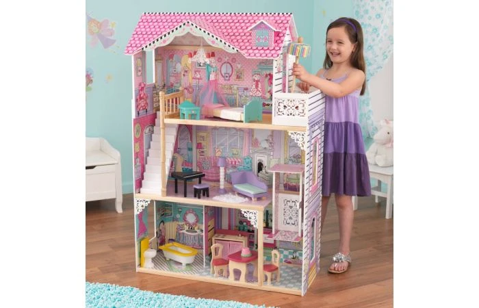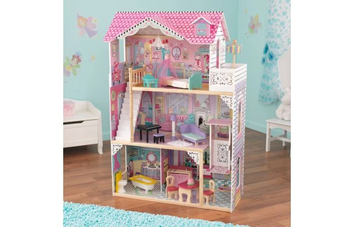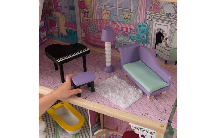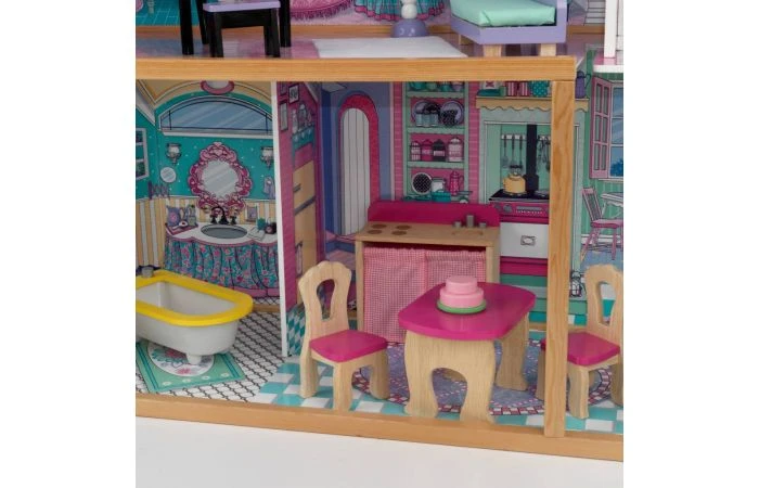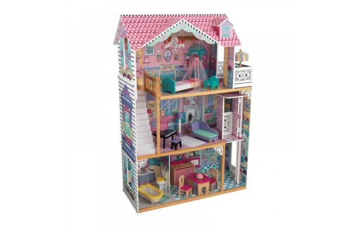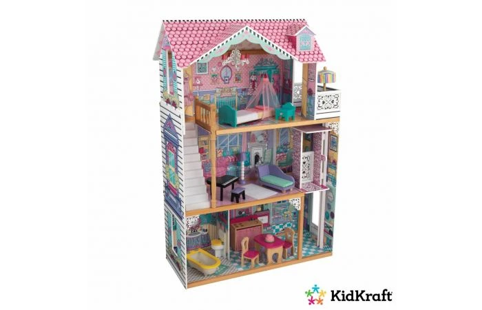 Het felgekleurde, vrolijke Annabelle Poppenhuis van KidKraft is ruim 1,20 m hoog en telt drie verdiepingen speelplezier, vier ruime kamers en een balkon. Een schuiflift brengt de poppen naar de tweede verdieping. De meegeleverde, 17-delige meubelset biedt eindeloze inrichtings- en speelmogelijkheden voor poppen van 30 cm