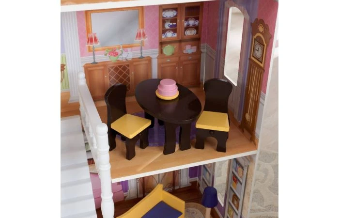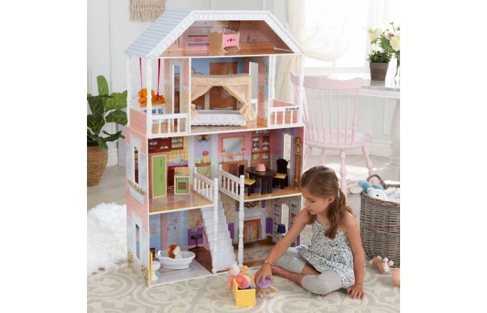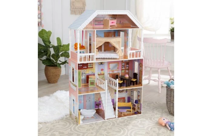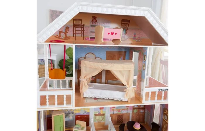 Het Savannah poppenhuis van KidKraft is een klassiek poppenhuis met zuidelijke elegantie. Het is ruim 120 cm hoog en heeft zes kamers en twee balkons, verdeeld over vier verdiepingen. De echt werkende balkonschommel en het hemelbed maken de zuidelijke sfeer helemaal af. De meegeleverde 10-delige accessoireset omvat prachtig gedetailleerde handgeverfde meubels voor modepoppen van 30 cm.