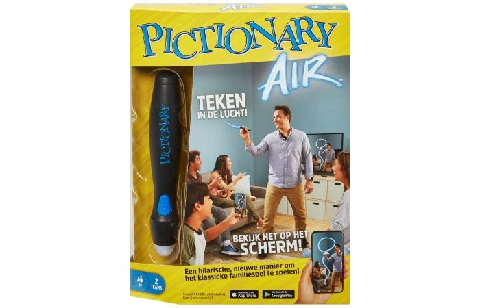 Pictionary Air, een doldwaze manier om het klassieke gezelschapsspel te spelen! Download de Pictionary Air app op je smartphone of tablet, pak een kaart met aanwijzingen en teken met de Pictionary Air pen in de lucht. Richt de camera in de app op de speler die tekent en je ziet die speler mét zijn tekening op het scherm van je apparaat verschijnen. Het wordt nog leuker als je de tekeningen naar een TV streamt via Apple TV of Chromecast. Kijk op de ondersteuningspagina van Pictionary Air (www.pictionary.com/support) welke apparaten je hiervoor kunt gebruiken. Je score wordt bijgehouden in de app, zodat je altijd kunt zien hoe jouw team ervoor staat. Een leuk gezelschapsspel voor een feestje of een spelletjesavond. Wordt inclusief 1 AA-batterij geleverd. Geschikt voor 2 teams van 4 tot 12 spelers vanaf 8 jaar.
