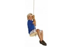 Deze schommel bestaat uit een multiplexschotel van Ø30 cm en is beschermd met een laag vernis die de natuurlijke houtkleur van het multiplex tot haar recht doet komen.
