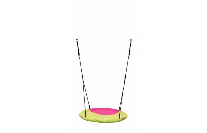 De zwarte gevlochten touwen geven de nestschommel een mooi uitzicht en zijn eenvoudig in lengte verstelbaar. Het stalen frame is volledig omhuld met foam om een zachte impact te verzekeren. Het stoffen materiaal is sterk maar ook aangenaam om aan te raken. Water kan eenvoudig wegvloeien. De ringen en stelachten zijn vervaardigd in gegalvaniseerd staal.
