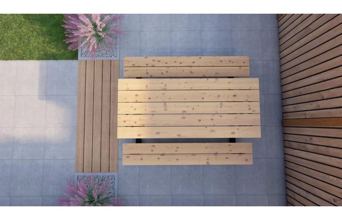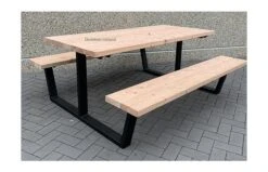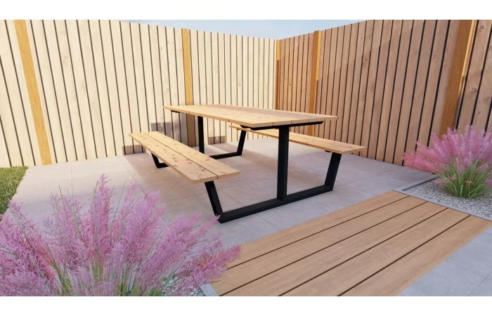 Robuuste picknicktafel die gemaakt is van een matzwart gepoedercoat ijzer frame met een fijne korrel structuur. Deze tafel is afgewerkt met geschaafde Douglas balken. Dit materiaal heeft sterke eigenschappen en heeft onbehandeld een zeer lange levensduur. Door de combinatie van ijzer met Douglas hout krijgt u een Robuust uiterlijk.