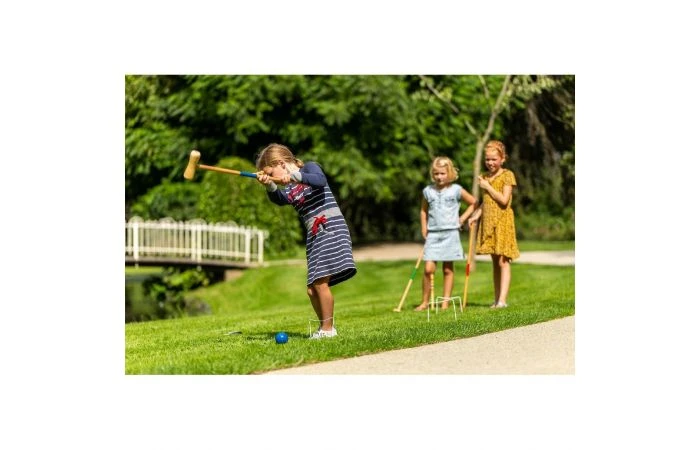 - Inhoud: 4 croquet hamertjes van 75 cm, 4 ballen van 7,3 cm doorsnee, 2 houten stokken en 10 metalen poortjes.