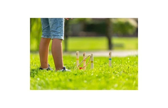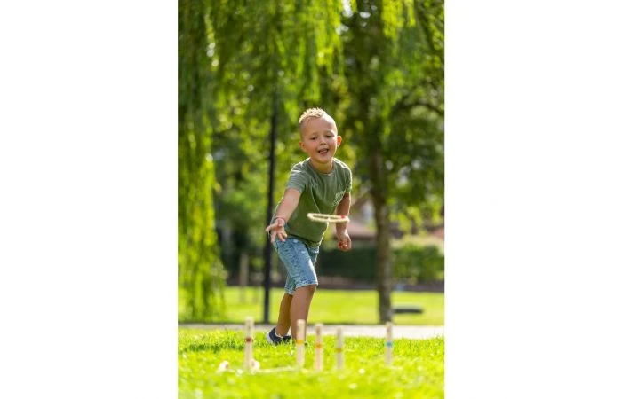 - Inhoud: 5 ringen touw en 5 palen van 15 cm hoog.Â