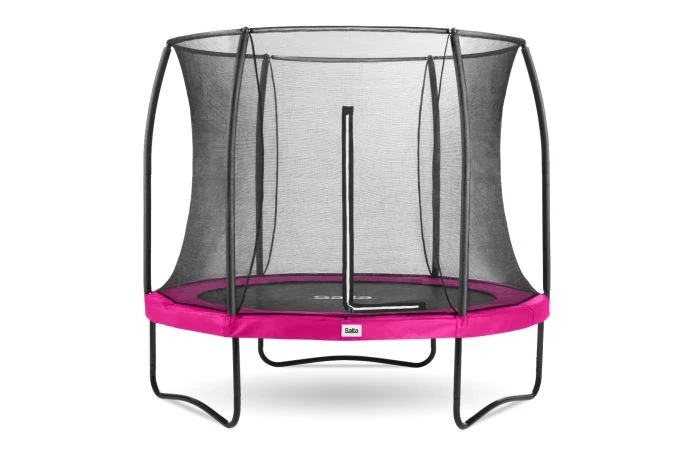 Het stalen frame is gegalvaniseerd, voorzien van een zwart glanzende coating en geeft de trampoline een veilige basis. Het veiligheidsnet is zodanig ontworpen dat het optimale bescherming en veiligheid biedt tijdens het springen. De constructie van de stalen topring zorgt er tevens voor dat het zachte, fijnmazige net in een elegante vorm wordt gehouden en daardoor extra mooi gespannen blijft. Daarbij is de ingang van het veiligheidsnet voorzien van een dubbelzijdige rits, zodat je de trampoline gemakkelijk kunt betreden en het net goed kan afsluiten.