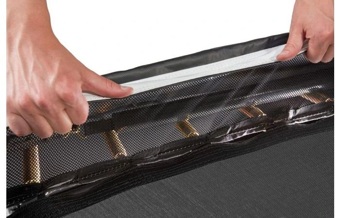 De buitenzijde van de Royal Baseground is uitgerust met stevige panelen die zorgen voor een zeer stabiele fundering. Het duurzame en robuuste frame is dubbel gegalvaniseerd en voorzien van een zwarte poedercoating om roestvorming tegen te gaan. De zwarte veiligheidsrand van de Royal Baseground bestaat uit stevig en hoogwaardig PVC-materiaal. Door het handige net-systeem dat aan de veiligheidsrand is bevestigd, is het voor kinderen onmogelijk om in aanraking te komen met de veren. Bovendien loopt de rand aan de buitenkant mooi door over het gras zodat kinderen de trampoline veilig kunnen betreden.