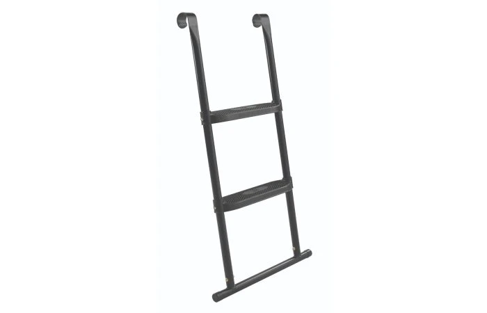 De 2 kunststof tredes hebben een antislip profiel en zijn schuin in het frame geplaatst. De trap heeft haken aan de bovenkant van het frame voor de montage aan de rand van de trampoline. Een horizontale ligger voorkomt het wegzakken van de poten in de ondergrond.