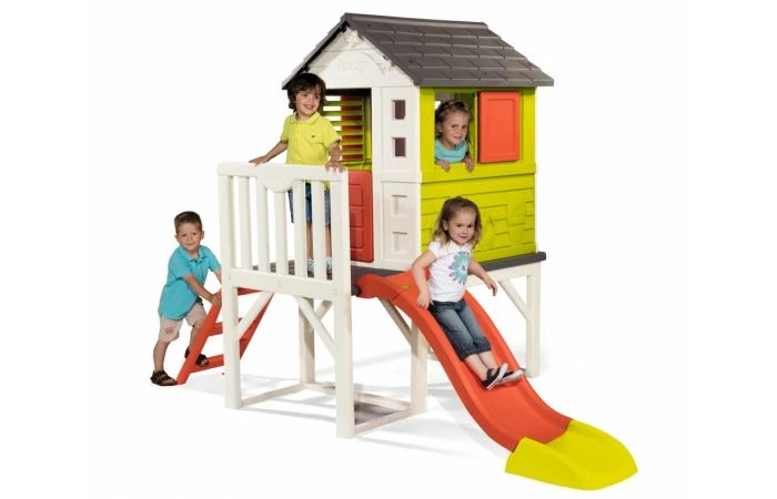 Terwijl een van je kinderen plezier zal hebben met de glijbaan, kan de ander duizend verhalen op de veranda van het huis bedenken! Je kleintjes kunnen verstoppertje spelen dankzij de twee schuifdeuren waarmee ze het spel kunnen winnen!