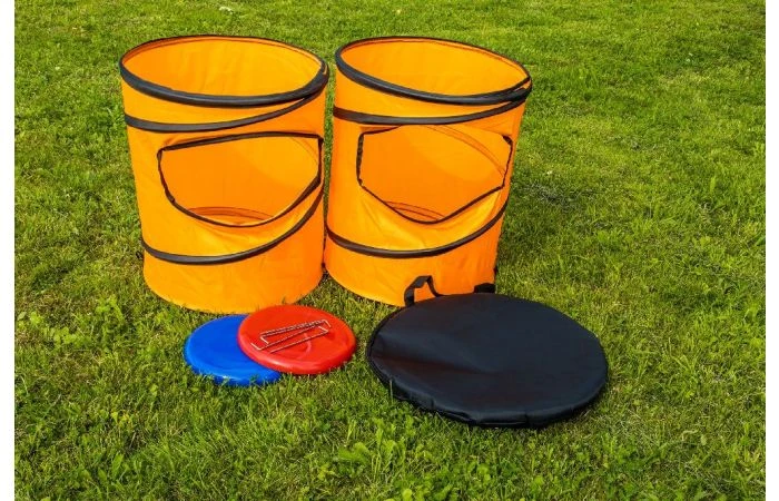 Summertime frisbee game set. Frisbeeën wordt nu nog leuker! Bij deze set zitten namelijk twee emmers, die je als target kunt gebruiken. Je zet ze ongeveer 15 meter uit elkaar, bijvoorbeeld op een grasveld of op het strand. Je kunt ze extra stevig in de grond plaatsen met de bijgeleverde haringen. Je kunt dit spel met 2 of 4 personen spelen. Het is de bedoeling, om de frisbee zo goed mogelijk richting de emmer te gooien. Als ‘ie de emmer aanraakt krijg je 2 punten. Landt de frisbee in de emmer, krijg je 5 punten! Bij het spel met 4 spelers komt er een extra dimensie bij: dan mag jouw teamlid helpen om de frisbee in de juiste richting te sturen. Wie het eerste 21 punten heeft verzameld, wint het spel. Inhoud: twee oranje pop-up emmers, een rode frisbee, een blauwe frisbee en zes haringen. Je kunt de set opruimen in de handige draagtas. Geschikt voor kinderen vanaf 5 jaar.