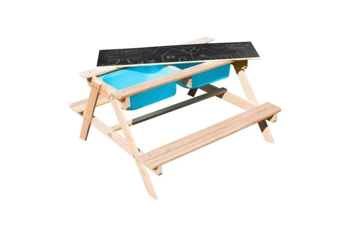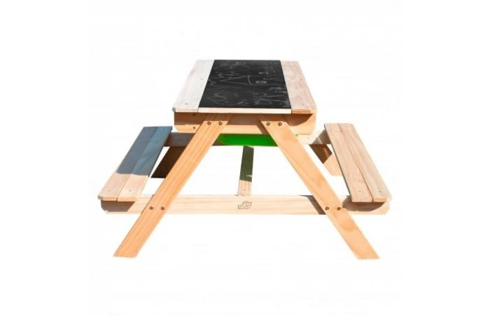 De Dual Top 2.0 Zand & Water Picknicktafel van Sunny heeft alles in één! Met deze zand & water tafel kan de creativiteit van de kinderen worden gestimuleerd. De zand & watertafel is voorzien van een afneembaar tafelblad met aan de onderkant een krijtbord. Zo kunnen kinderen allerlei creaties maken en als ze klaar zijn kan het tafelblad aan de kant gezet worden om met zand en water te spelen. Onder het tafelblad bevinden zich namelijk twee kunststof bakken met beide een inhoud van circa 11 liter. Deze groene bakken kunnen gevuld worden met zand en/of water, maar je kunt er natuurlijk ook speelgoed in opbergen. Daarnaast zijn de bakken uitneembaar, zodat deze eenvoudig schoongemaakt kunnen worden. De klassieke combinatie van zand en water is altijd een succes bij kinderen! Uitgespeeld? In een handomdraai verander je de zand en water tafel weer in een picknicktafel waaraan de kinderen kunnen knutselen, tekenen of genieten van wat lekkers. Geschikt voor kinderen van 2 tot en met 7 jaar oud.