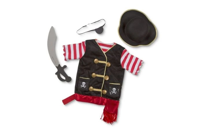 Inhoud: piratenvest met sabelhouder en sjerp, ooglapje, hoed en een zwaard van zacht materiaal