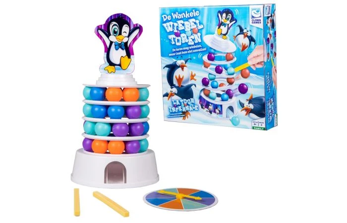 Clown Games wankele wiebeltoren. Plaats de balletjes op de basis en leg er een ring op. Zo bouw je een hoge toren. Nu ga je draaien aan de draaischijf. De kleur waarop ‘ie eindigt, geeft aan welke kleur het balletje moet hebben, dat je moet verwijderen. Dit doe je met behulp van een stokje: hiermee valt het balletje in de basis en komt hier weer uit rollen. Elk balletje dat verwijderd wordt, maakt de toren minder stabiel. De speler, die uiteindelijk de toren laat vallen, heeft verloren! Geschikt voor 2 spelers vanaf 5 jaar.