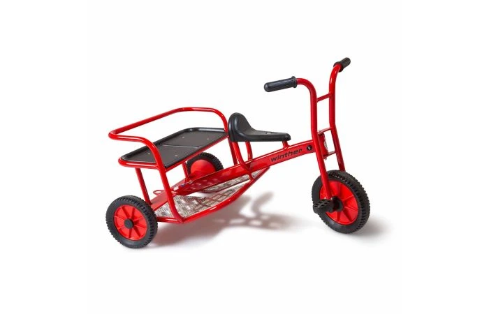 Stap samen met je vriendje achterop de taxi en race met z’n drieën het hele plein over. De taxi tweezits is robuust, veilig en duurzaam. Frame van buizenstaal, zonder scherpe hoeken of kanten. Achter deze driewieler kan een aanhanger gekoppeld worden met de veiligheidskoppeling.